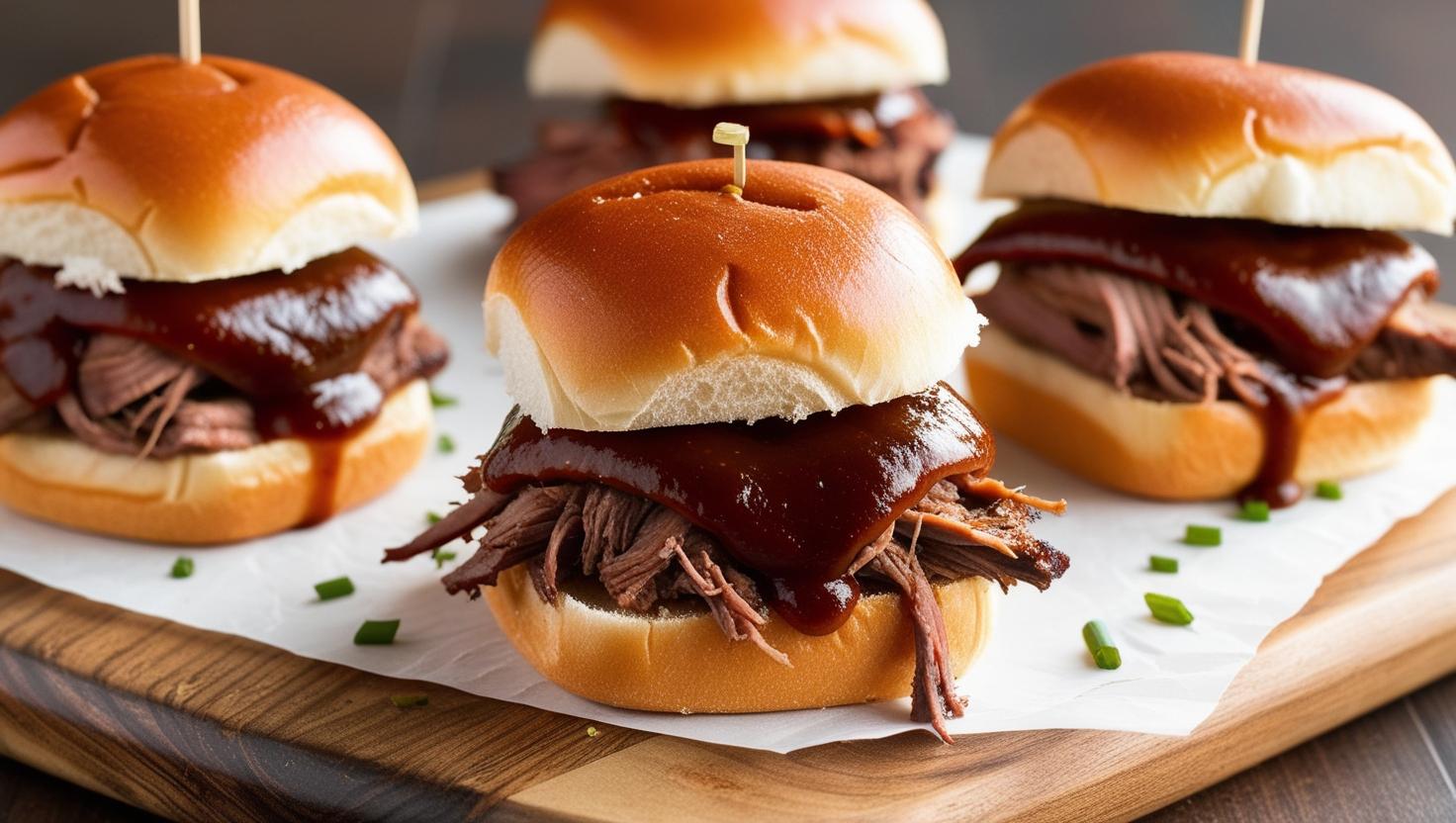 Mini-Rinderbrisket-Sliders, die mit zartem, geräuchertem Brisket und einer leckeren BBQ-Sauce gefüllt sind. Ein kleiner, aber kräftiger Bissen, der dich mit jedem Happen in den BBQ-Himmel katapultiert.